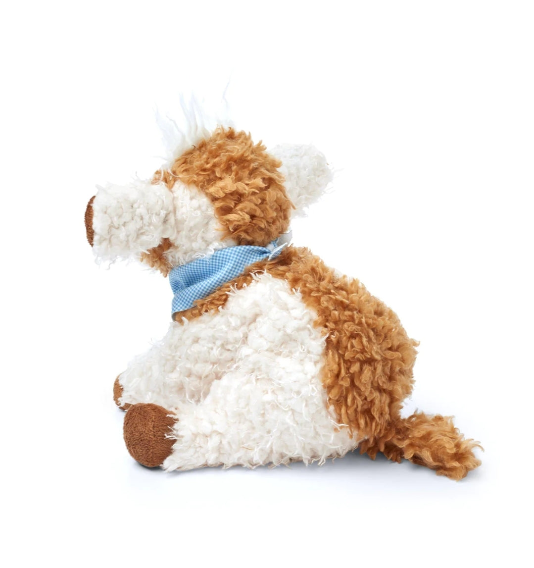This cow is moo-cho cute in cream and mocha brown shaggy fur with soft velour features. A favorite of all the Good Friends Farm collection, this is udderly more than your average stuffed cow with a handsome blue checked bandana tied around his neck and a fun tuft of white hair upon his head.