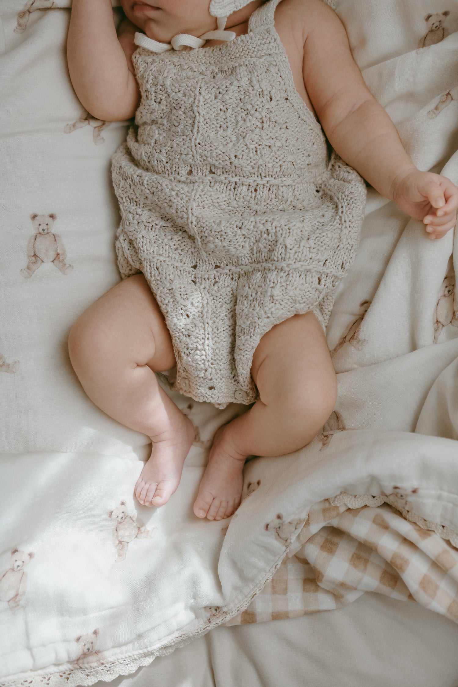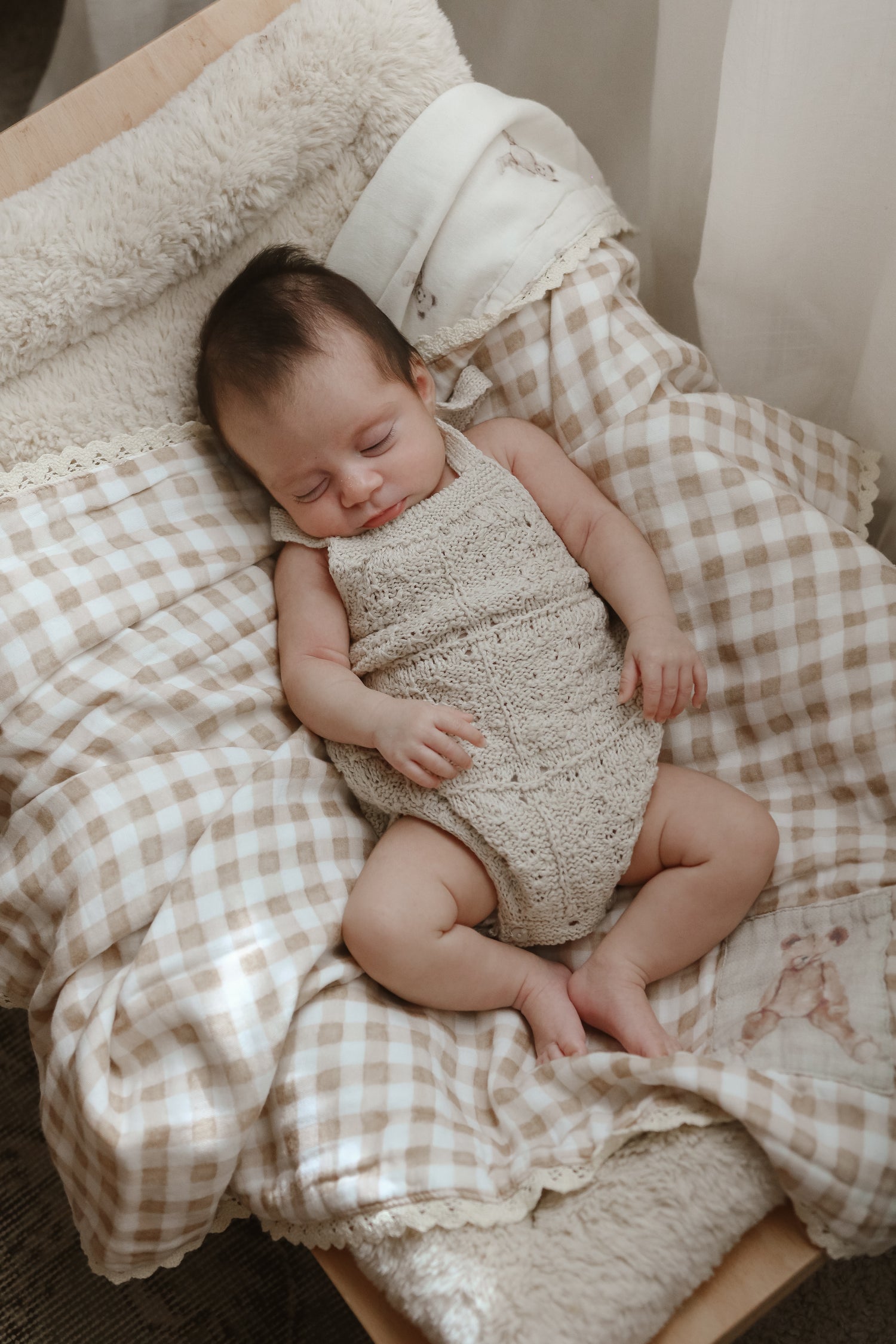 In collaboration with Tabitha Paige, the new Teddy Bear Patch blanket features beautiful hand painted gingham on the front with a teddy bear cotton patch on the bottom right hand corner. The back features the tossed teddy bears on a cream background. They are REVERSIBLE, and all one blanket.
