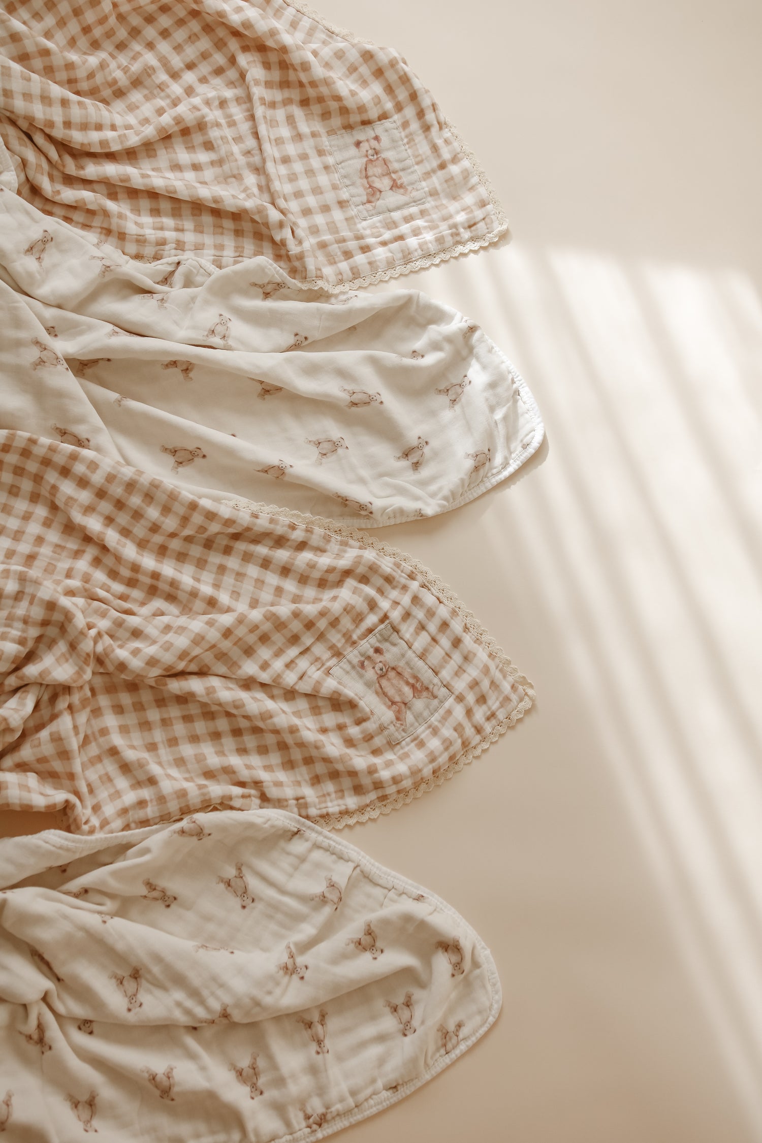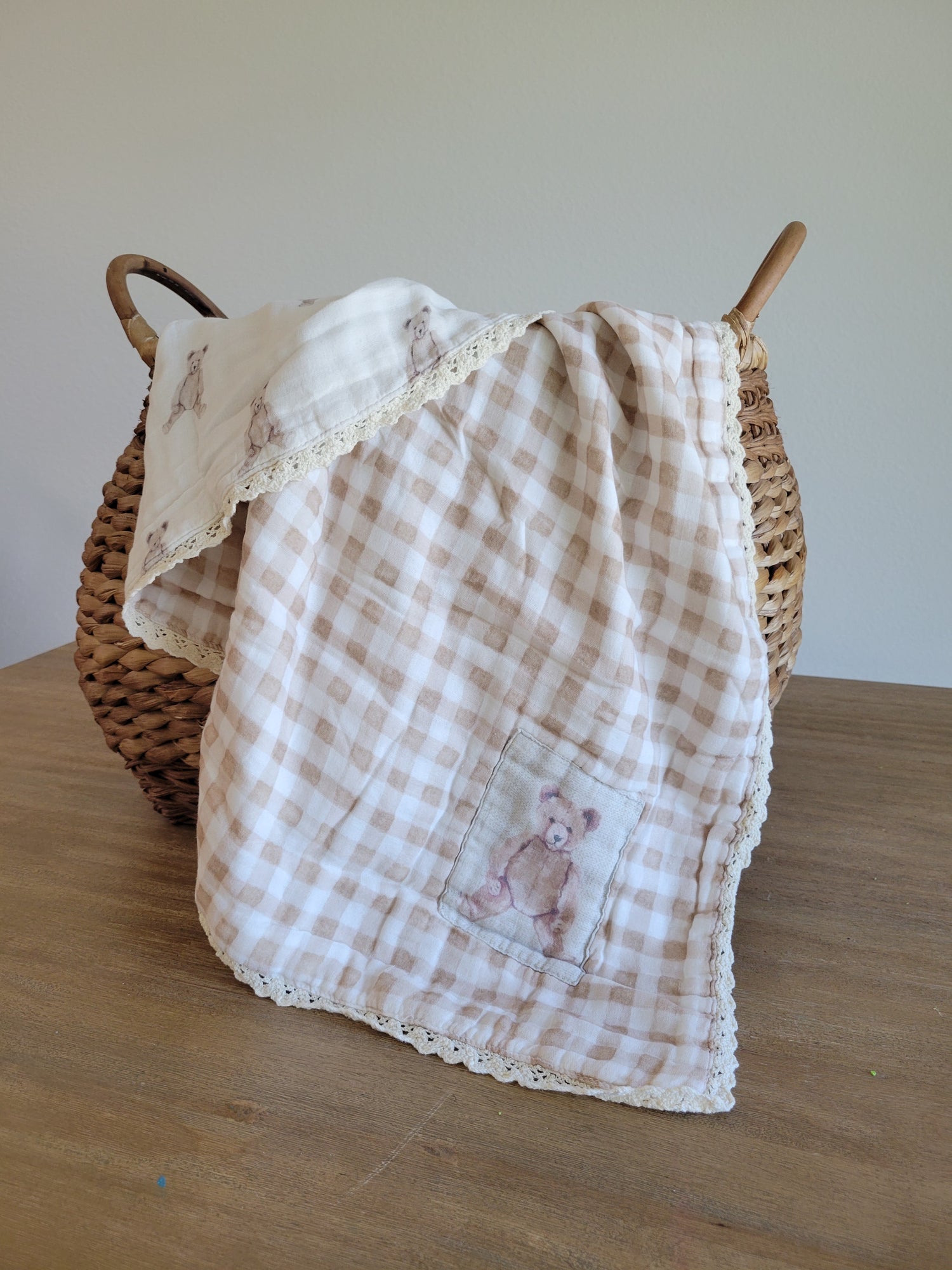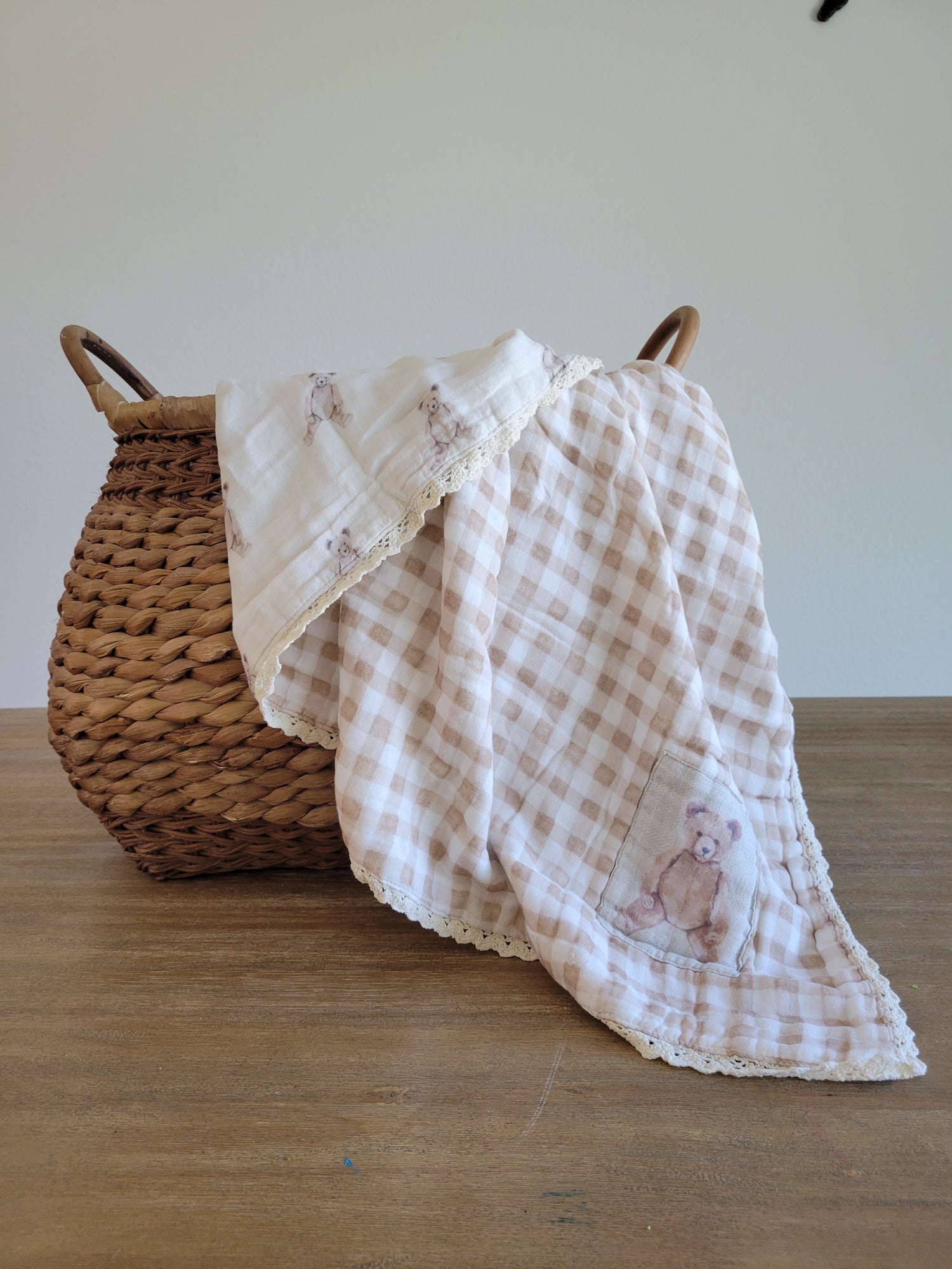 Teddy Bear Patch QUILTED 6 Layer Gauze Blanket